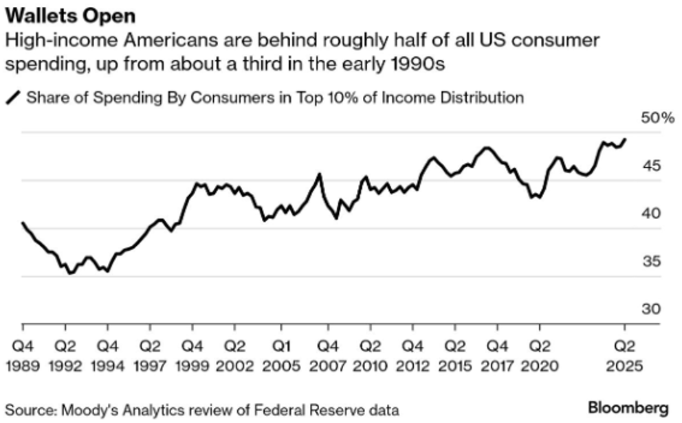 - Research from Moody’s Analytics indicates that the US economy is increasingly relying on the wealthiest consumers. Data shows that the richest 10% of households account for almost 50% of total US spending, up from 35% in the early 1990s. Wealth disparity issues aside, the concentration of economic activity in such a small subset of the populace risks longer recession and recovery timelines in the event of a financially led downturn.