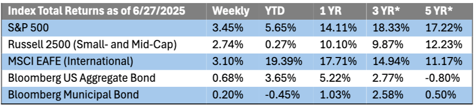 - The S&P 500 and the Nasdaq Composite both closed at new record highs on Friday, June 27. The S&P was up 3.4% for the week of June 23, and the Nasdaq jumped 4.3%. The VIX was back at a benign mid-teens level as Israel/Iran conflict concerns waned. The S&P 500 has climbed an incredible 24% since its tariff-induced lows on April 8. Stay invested, folks.