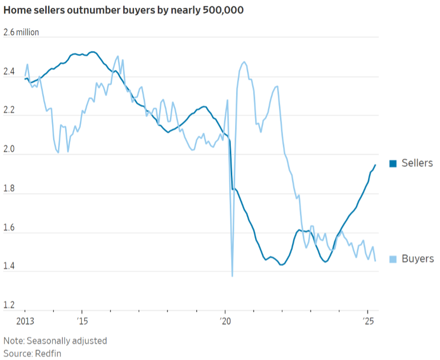 [7] Friedman, Nicole. “New Real-Estate Math: Half a Million More Sellers Than Buyers.” The Wall Street Journal, 14 June 2025, https://www.wsj.com/economy/housing/housing-market-new-supply-prices-210b14f2?mod=djem10point.