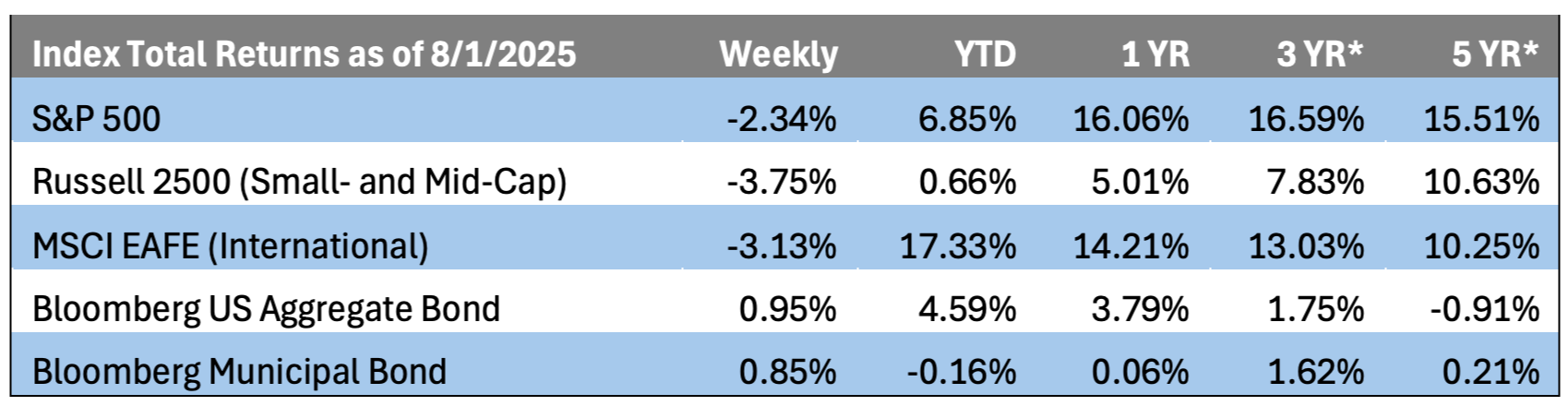 - The week ended, August 1 lived up to its billing as the summer’s (and perhaps the year’s) most impactful by way of global trade developments, a litany of significant economic data releases, and corporate earnings reports from market-moving Big Tech firms.