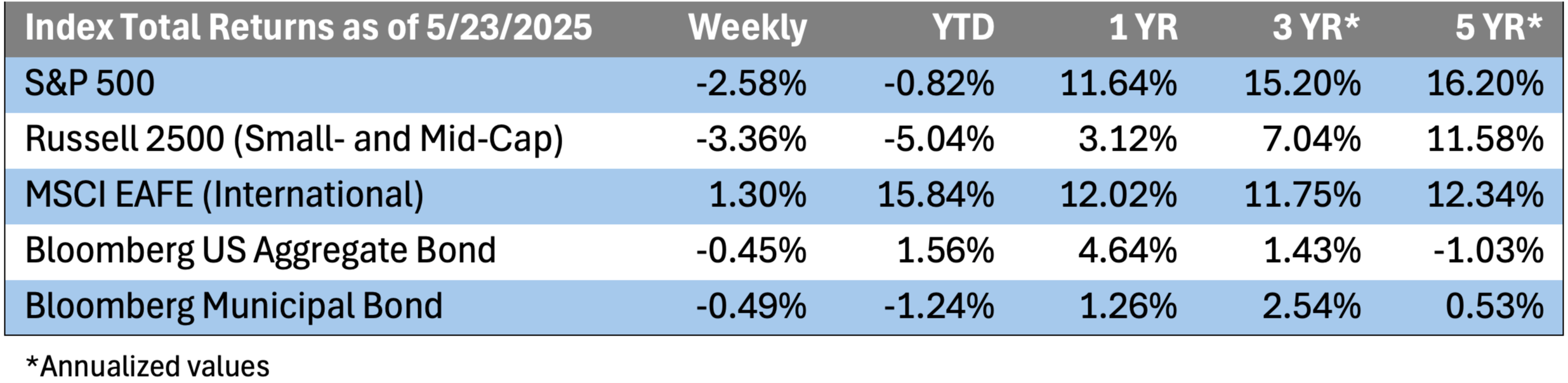 - President Trump ushered in the holiday weekend by lashing out on Truth Social on Friday, May 23. The targets this time around? The European Union and Apple. Apparently not thrilled with the EU’s sense of urgency (or lack thereof) to approach the negotiating table, Trump took to his social media outlet to threaten a 50% tariff on EU goods starting June 1. Apple’s attempt to shift iPhone production away from China and into India, but not the US, has drawn Trump’s ire as well, resulting in a 25% tariff threat on all imported iPhones. Stocks fell on the day, and the S&P 500 closed down 2.6% for the week.